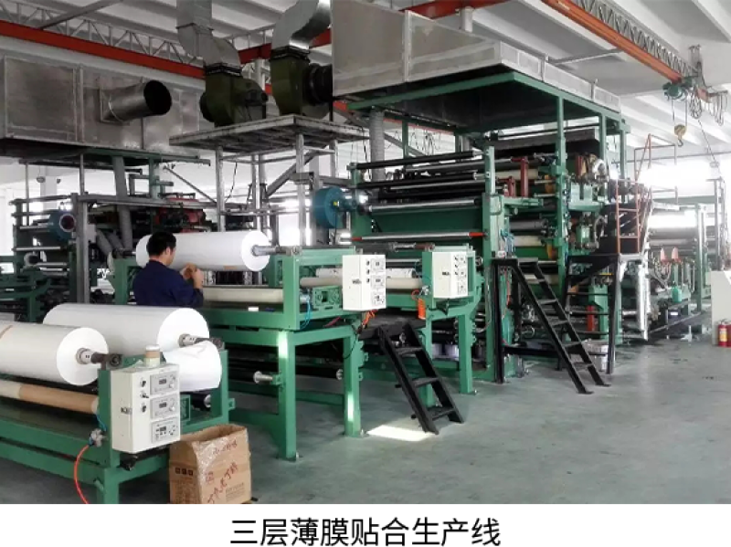 薄膜多层热贴复合生产设备,生产工艺流程:多层多台放卷机、多层多台预热辊机、贴合加热大辊机、引离辊机、压花机、冷却机、切边复合保护膜机、储料架、自动切割收卷机。
